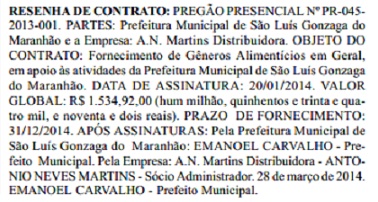 Desta vez, a empresa A. N. Martins Distribuidora vai embolsar R$ 1.534.092,00 (Um milhão, quinhentos e trinta e quatro mil e noventa e dois reais) para fornecer produtos alimentícios em geral durante um ano.