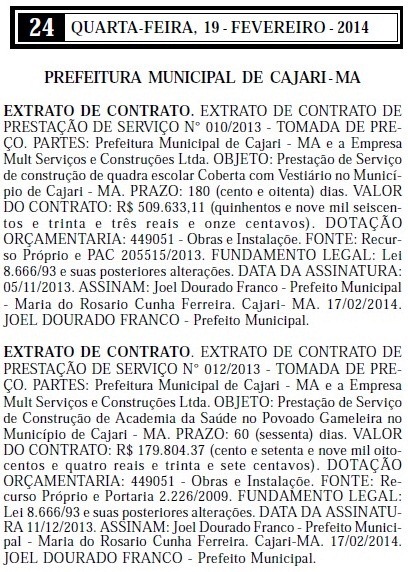 Há exatamente um ano, a empresa abocanhou dois contratos no município de Cajari. As prestações de serviços incluem a construção de uma quadra escolar e uma Academia de Saúde no Povoado Gameleira, que juntos, somam o valor de R$ 689.437,48. Os dois contratos por tomada de preços foram assinados pelo prefeito Joel Dourado Franco, o Dr Joel, em fevereiro de 2014 e tinha prazo para execução em 180 e 60 dias. Até hoje não há conhecimento se as obras foram realizadas.