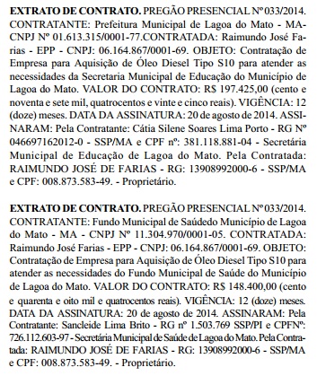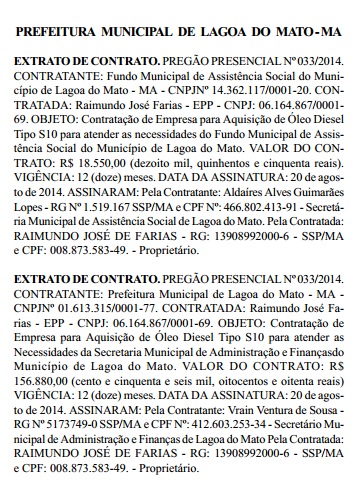 Os contratos possuem como objetivo a contratação de empresa para aquisição de óleo diesel tipo S10 que possa atender as necessidades da Secretaria Municipal de Assistência Social do Município de Lagoa do Mato. Todos os foram assinados no mesmo dia, 20 de agosto de 2014 e possuem o prazo de 12 meses.