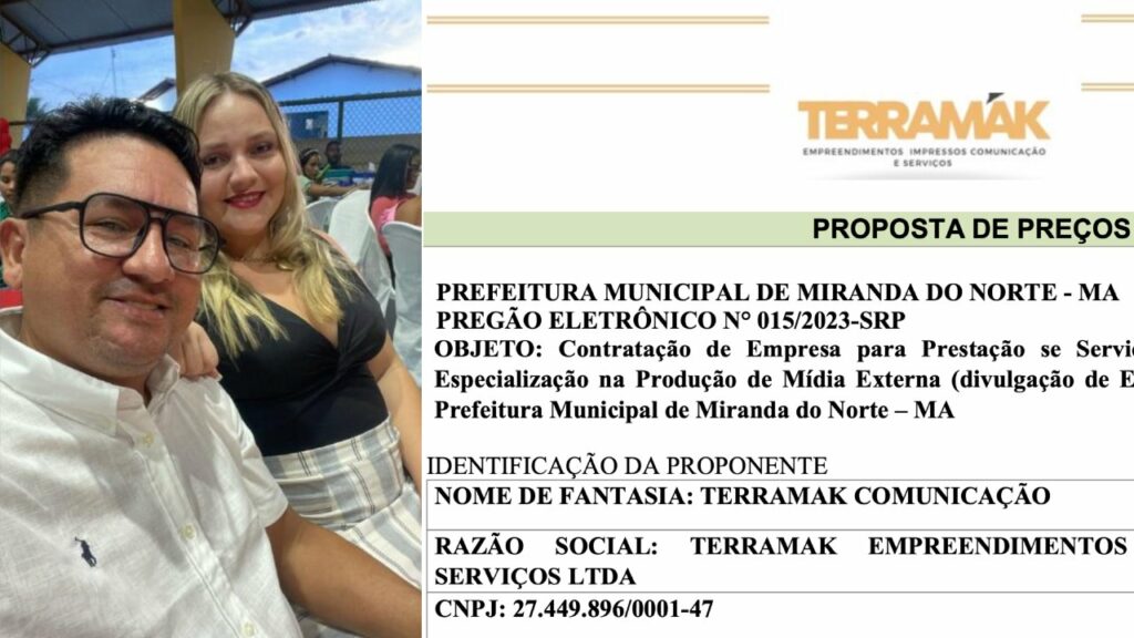 Um levantamento da Folha do Maranhão em dados no Portal de Transparência da Prefeitura de Miranda do Norte, no Maranhão, mostra que a empresa Terramak Empreendimentos Comunicação e Serviços Ltda, pertencente a empresária Fabiola Dhully Jesus Cunha, esposa do secretário de pesca de Miranda do Norte, Ednaldo Borges Campelo, o Dimas Campelo, foi declarada vencedora na licitação para contratação de serviços de publicidade onde seu marido trabalha.