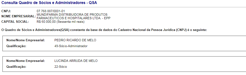 Já a Mundifarma, de propriedade de Pedro Ricardo de Melo e Lucinda Arruda de Melo, vai faturar apenas R$ 61.810,56 (sessenta e um mil oitocentos e dez reais e cinquenta e seis centavos).
