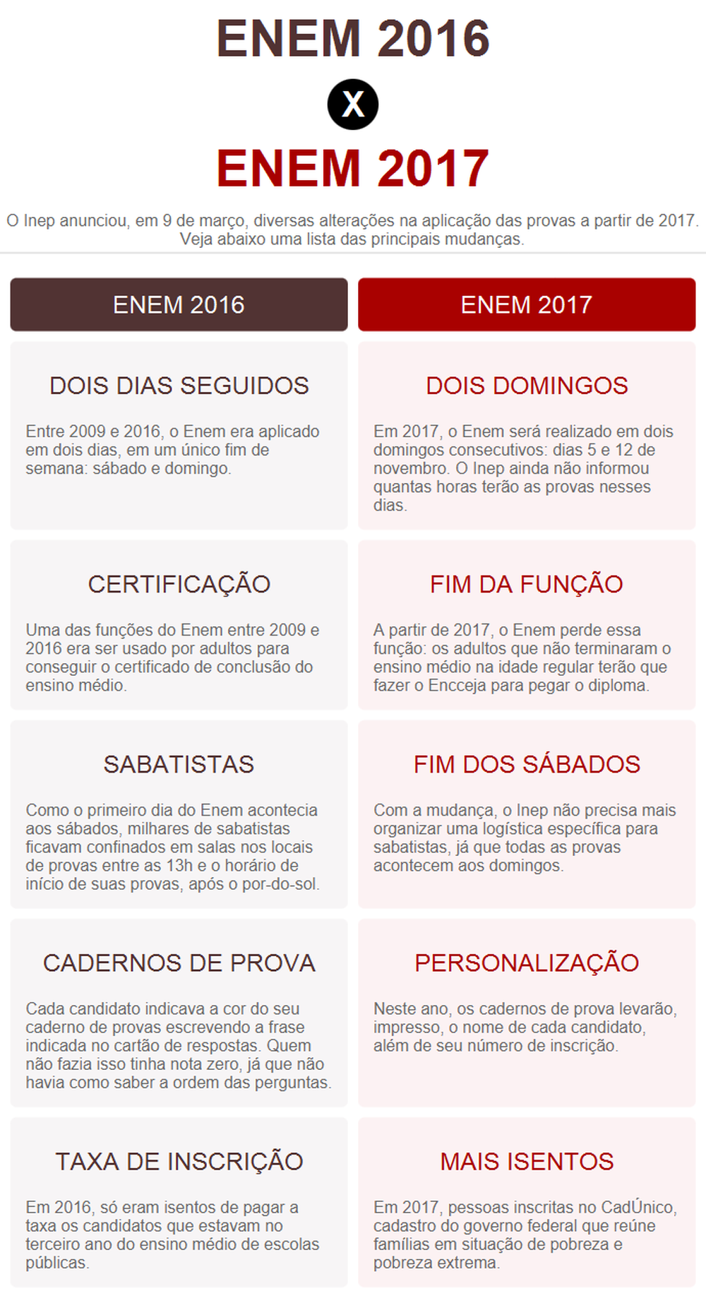 O Exame Nacional do Ensino Médio (Enem) 2017 será realizado em dois domingos consecutivos: 5 e 12 de novembro. No ano passado, a prova foi aplicada em um fim de semana (sábado e domingo, 5 e 6 de novembro). A modificação integra uma lista de novidades divulgadas pelo Ministério da Educação (MEC) na manhã desta quinta-feira (9).