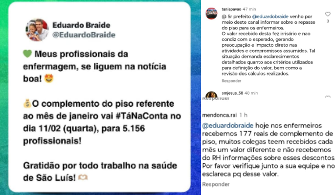 Outra profissional também afirmou que não recebeu o valor correto e pediu transparência: “Sr prefeito Eduardo Braide, venho por meio deste canal informar sobre o repasse do piso para os enfermeiros. O valor recebido desta vez foi irrisório e não condiz com o esperado, gerando preocupação e impacto direto nas atividades e compromisso assumidos. Tal situação demanda esclarecimentos detalhados quanto aos critérios utilizados para definição do valor, bem como a revisão dos cálculos realizados.”