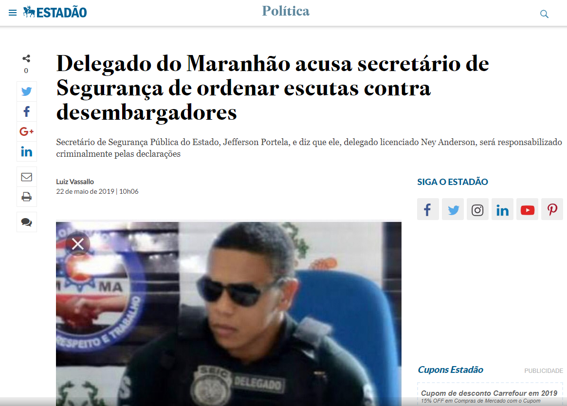 A série de acusações feitas contra o secretário de Segurança Pública, Jefferson Portela, pelo delegado Ney Anderson, ex-chefe do Departamento de Combate ao Crime Organizado (DCCO) e divugada, com exclusividade pelo Blog do Neto Ferreira, foi repercutida nacionalmente.
