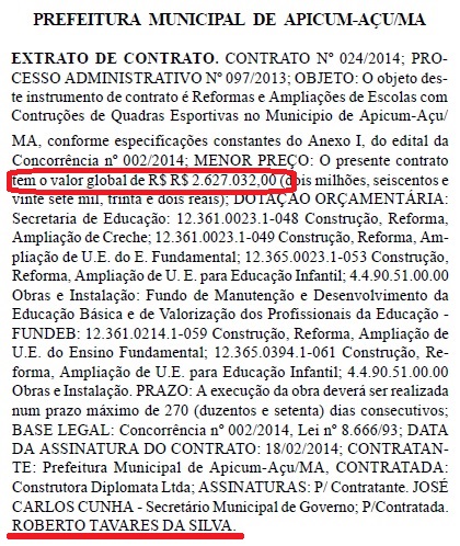Pelo contrato, a empresa de Roberto Tavares deveria concluir obras em 270 dias de reformas e ampliações de escolas com construções de quadras esportivas, ampliação da Creche, reforma da U.E. do E. Fundamental, ampliação da U.E. para Educação Infantil.
