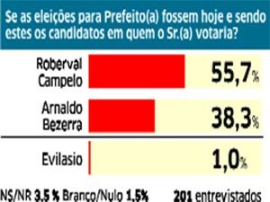 Roberval Campelo também leva vantagem em outro aspecto da pesquisa, o de rejeição. Com 25,9%, ele é o candidato menos rejeitado na disputa. Evilasio tem 26,9% e Arnaldo Bezerra é o mais rejeitado, com 38,8% do total de eleitores. ( O Estado do Maranhão ).