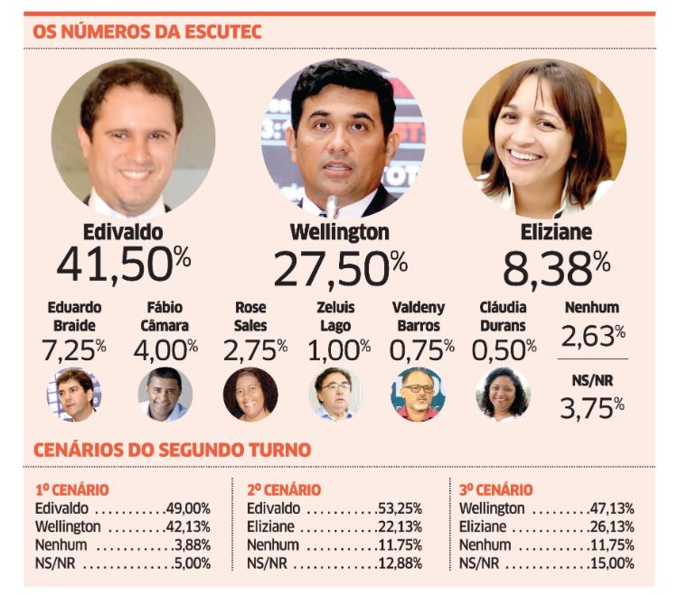 A pesquisa Escutec contratada pelo O Estado trouxe números importantes que remetem a uma eleição de segundo turno em São Luís. Com a margem de erro de 3 pontos percentuais para mais ou para menos, com intervalo de confiança de 95%, a pesquisa teve como entrevistados 800 pessoas nos dias 28 a 30 de setembro e foi registrado no Tribunal Eleitoral sob o protocolo MA05600/2016.