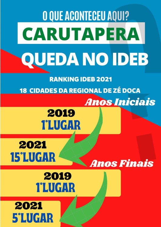 Dados do ranking do Ideb (Índice de Desenvolvimento da Educação Básica) da regional de Zé Doca mostram que em 2019 Carutapera ficou em 1º lugar referente aos anos iniciais e finais, já em 2021, durante a administração de Marques, o índice caiu e a educação da cidade foi para o 5º lugar.