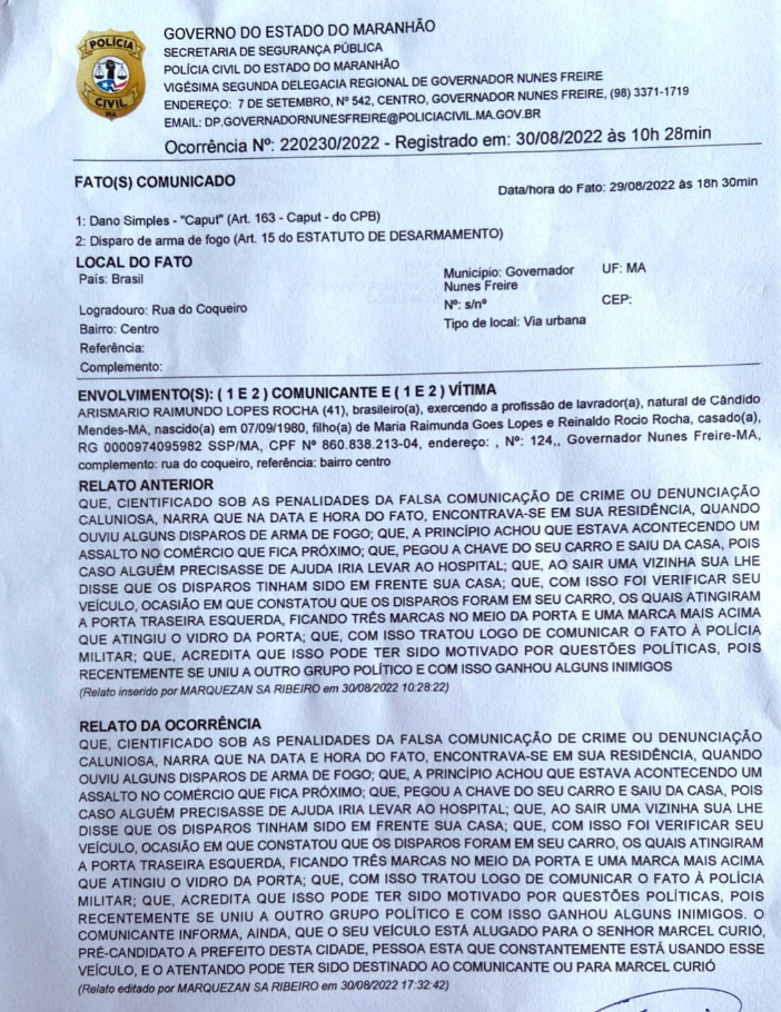 Carro usado pelo ex-prefeito de Governador Nunes Freire, Marcel Curió, foi alvejado por cinco tiros na última segunda-feira (29).