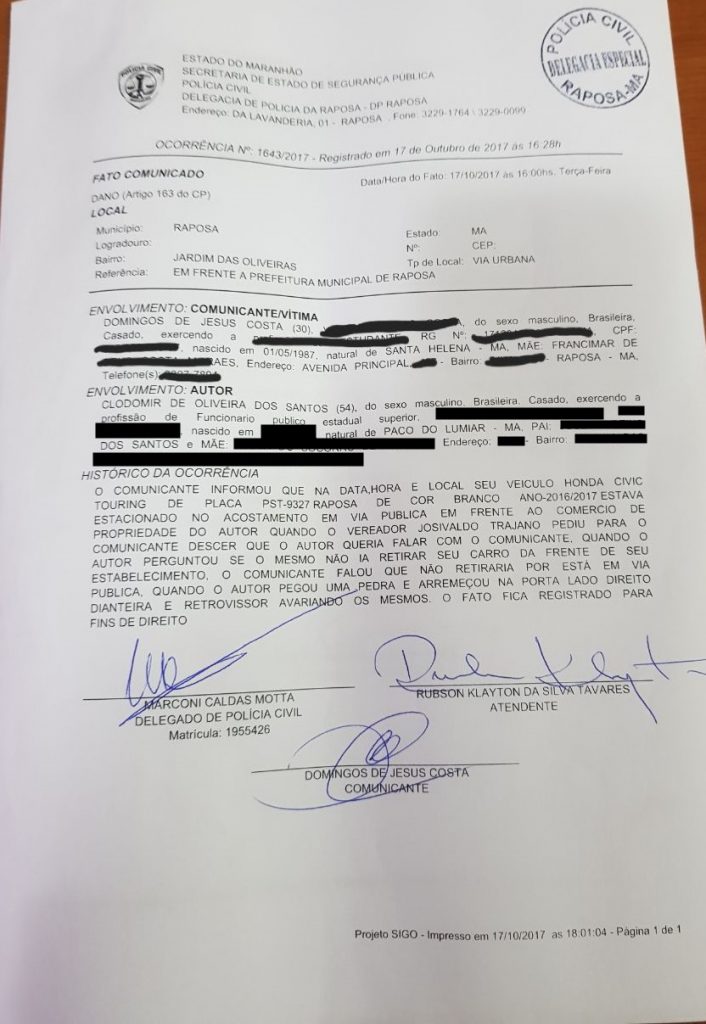 O blogueiro Domingos Costa teve o seu veículo apedrejado após estacioná-lo em frente ao comércio de propriedade de do ex-prefeito Clodomir Oliveira Santos, localizado na Raposa, segundo o Boletim de Ocorrência.