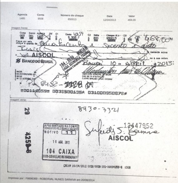 Abaixo, você ver o cheque sem fundo usado pelo ex-prefeito de Bacuri no dia 12 de abril de 2013.