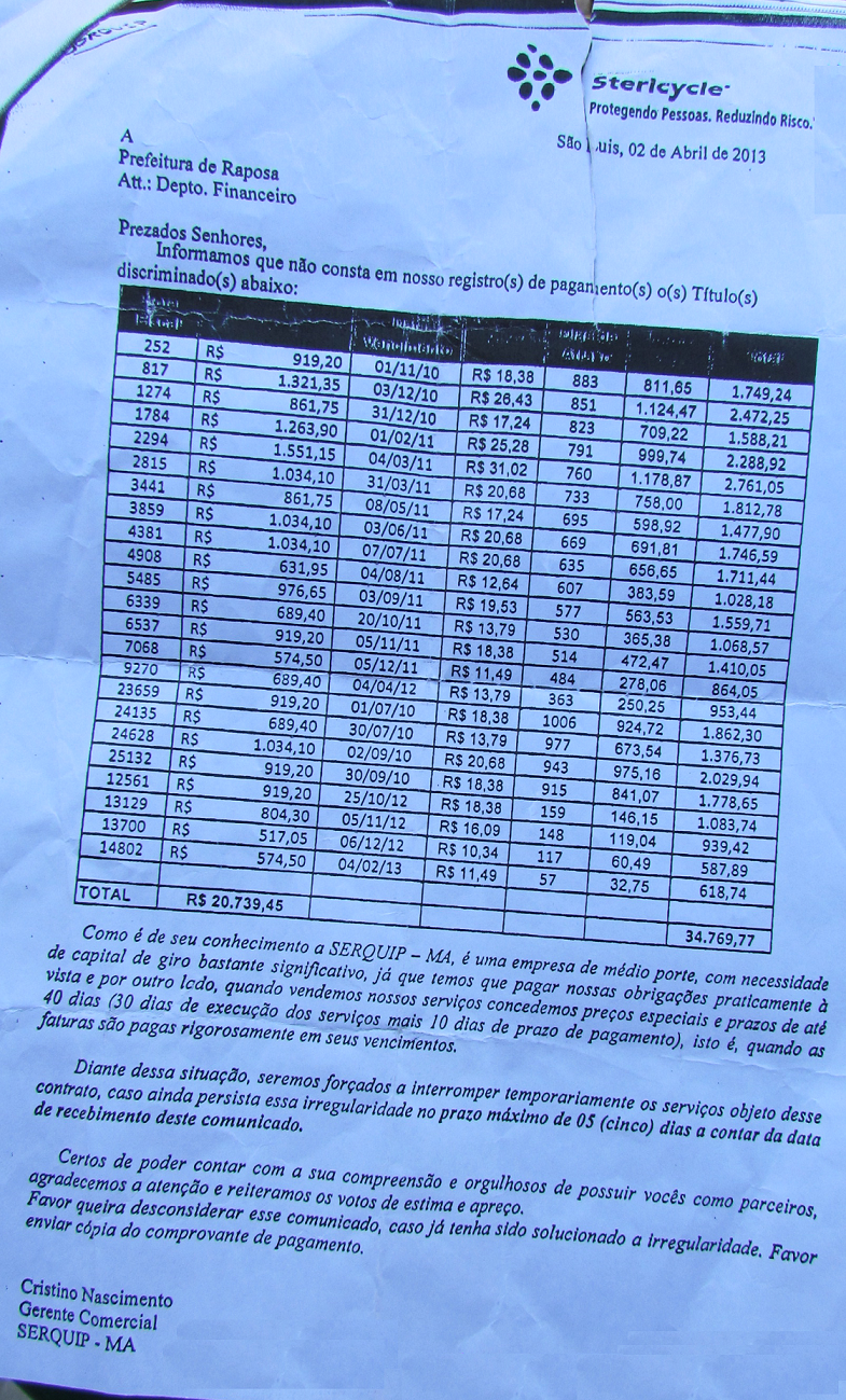 A empresa SERQUIP (Stericycle – “Protegendo Pessoas. Reduzindo Risco.”) que fazia a coleta e transporte do lixo hospitalar nas unidades de saúde da Prefeitura de Raposa na gestão do ex-Prefeito Onacy Paraíba, enviou documentação ao Departamento Financeiro da Prefeitura, recentemente já na gestão do Prefeito Clodomir, informando que foram forçados a interromper temporariamente os serviços diante dos atrasos nos pagamentos das faturas do contrato durante o período de três anos de inadimplência.