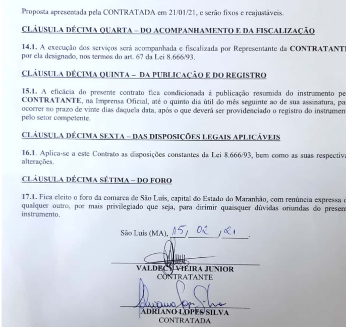 O documento mostra a assinatura de Valdecy, que ainda comandava a Semsa de São Luís. Ele deixou o cargo em abril de 2022 para concorrer a uma vaga na Assembleia Legislativa nas eleições de 2022.