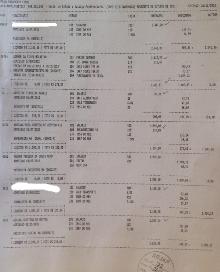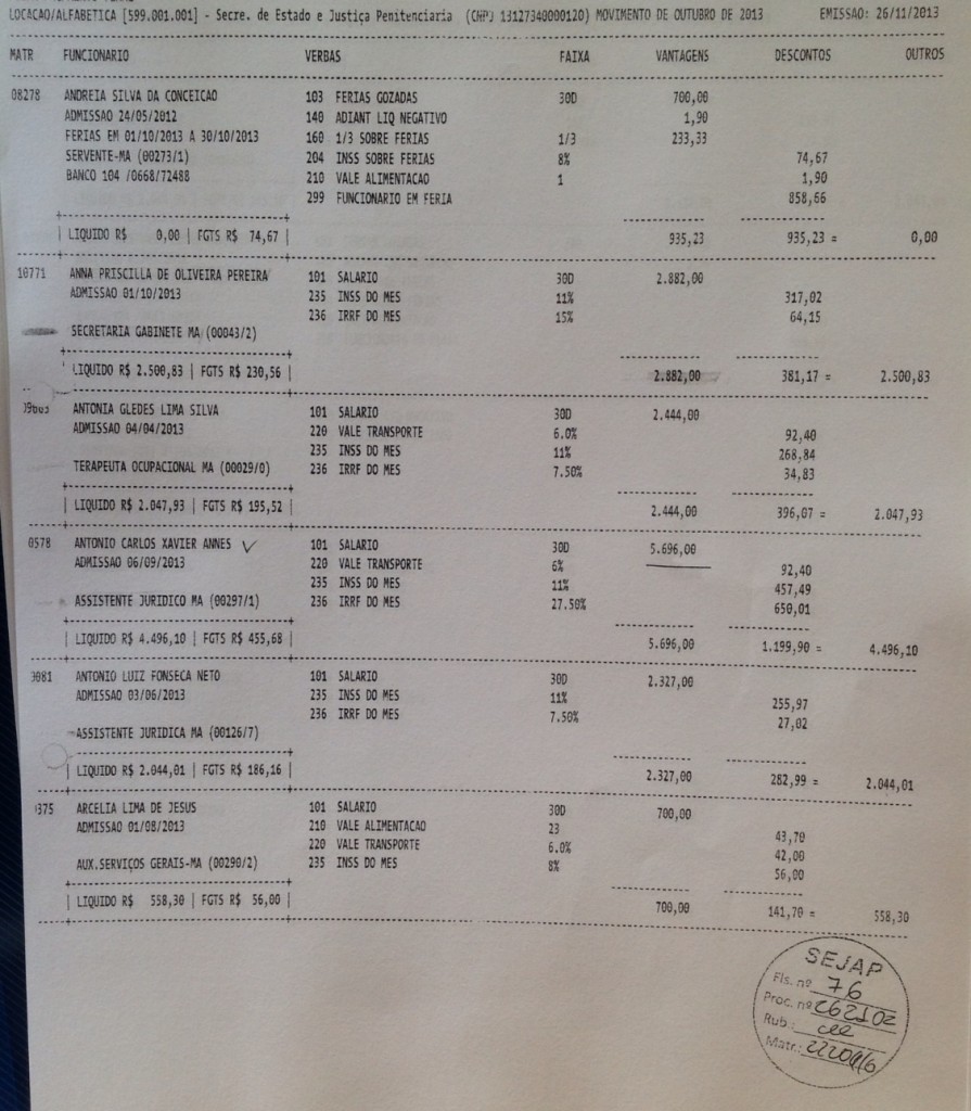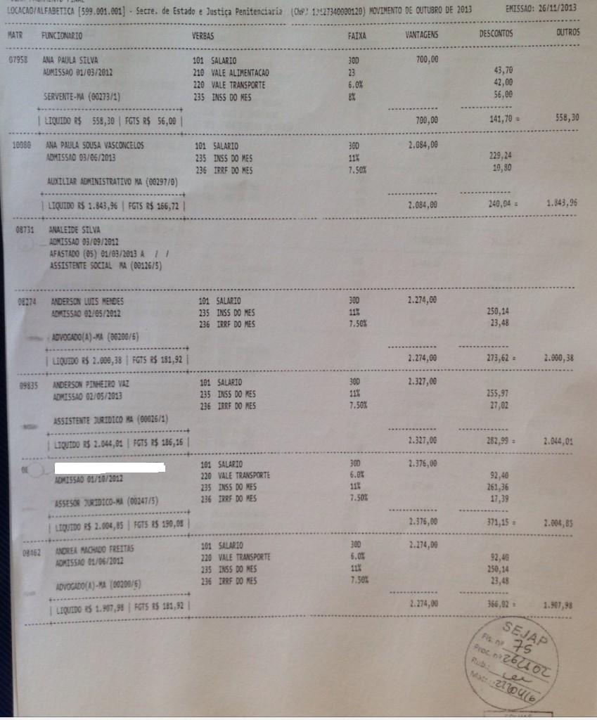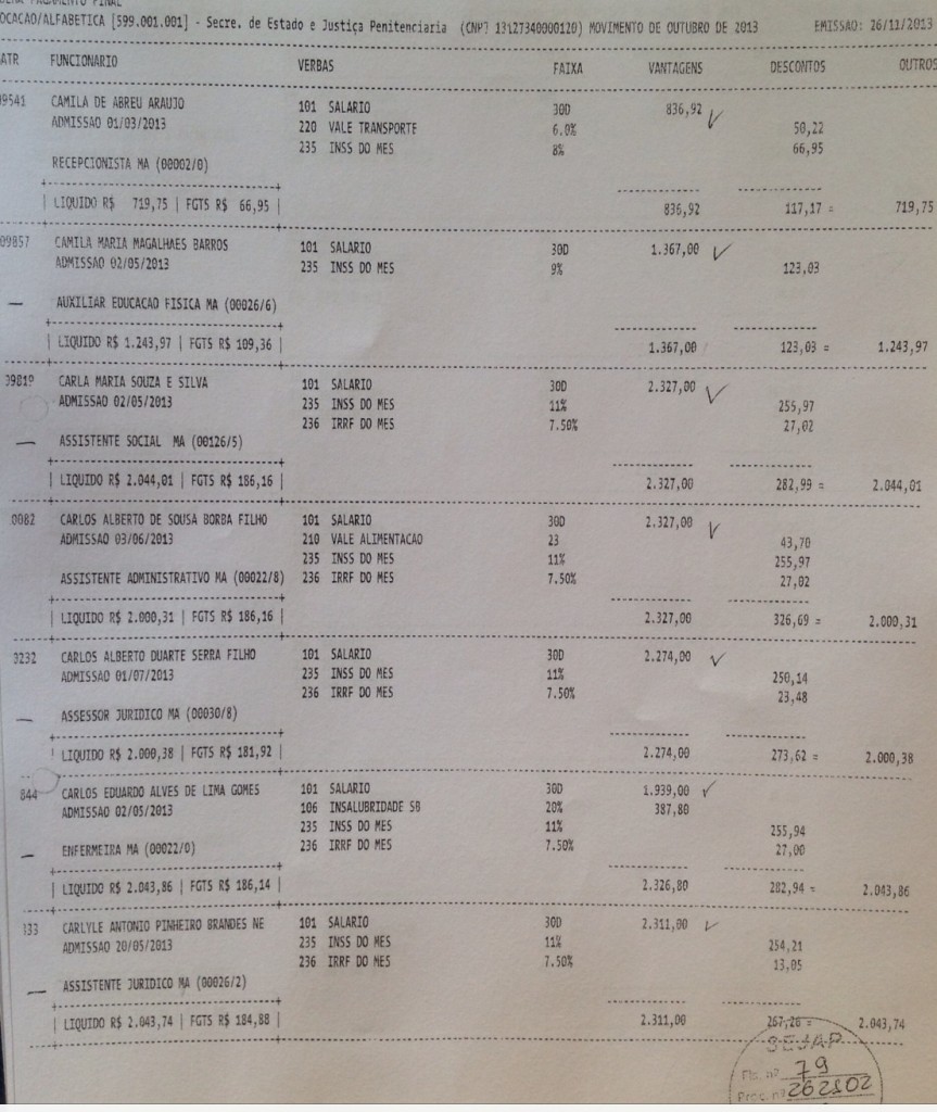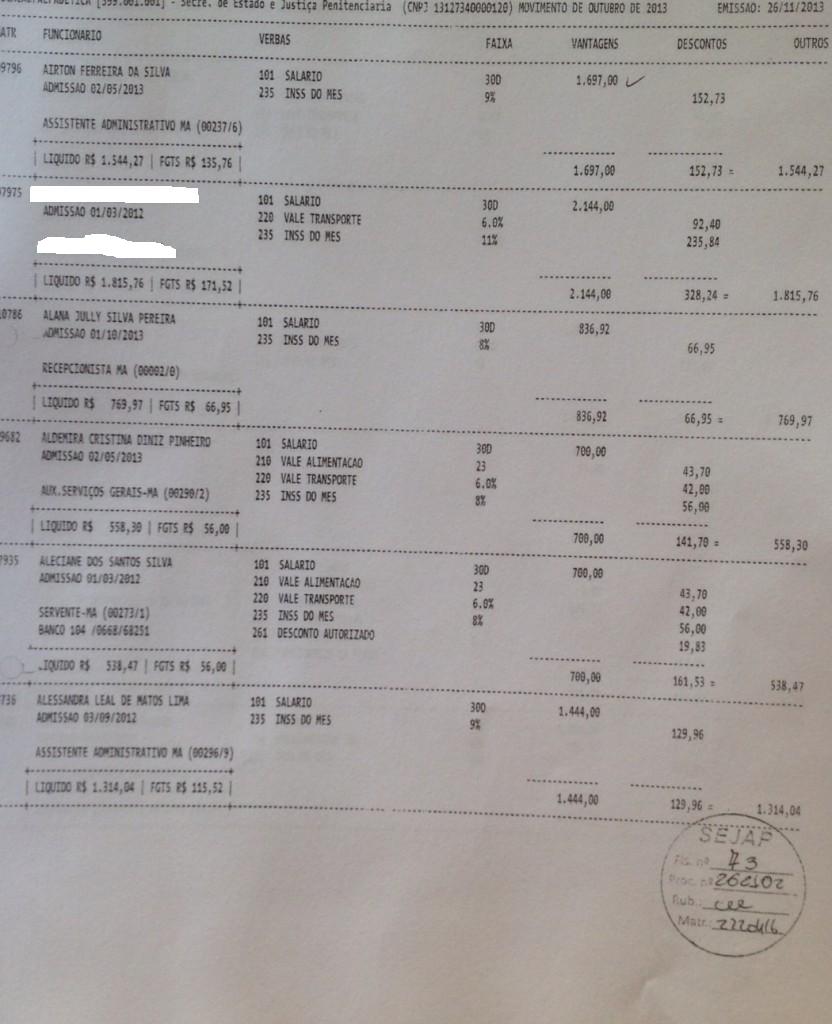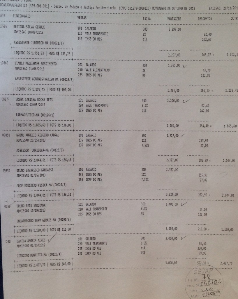 Abaixo a relação de parte dos funcionários da empresa de Eric Marinho que recebem através do contrato da secretaria SEJAP: