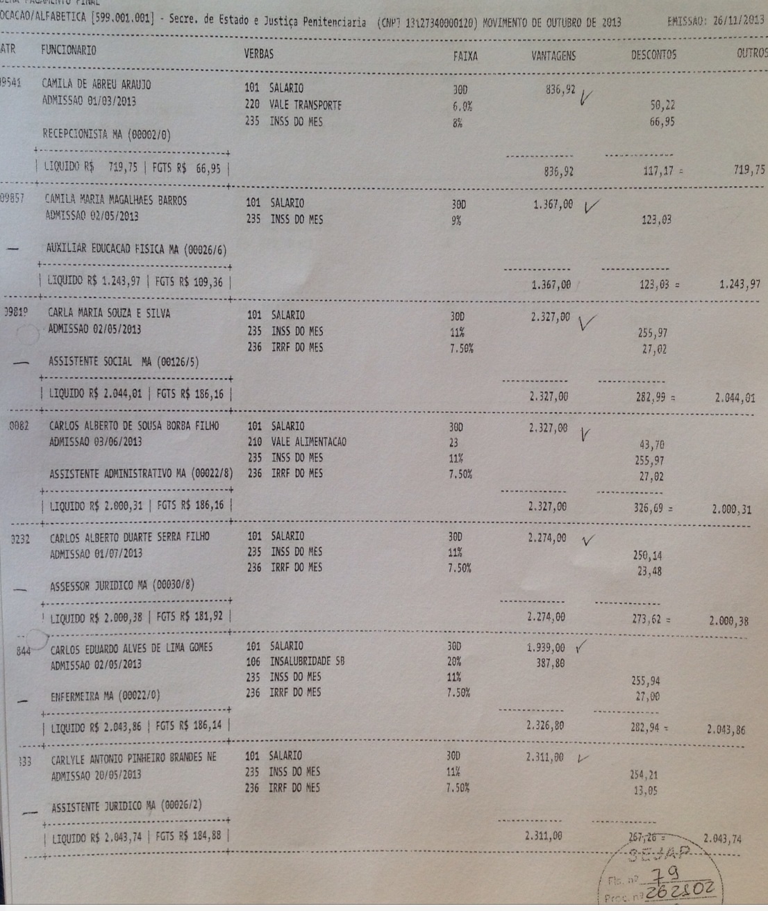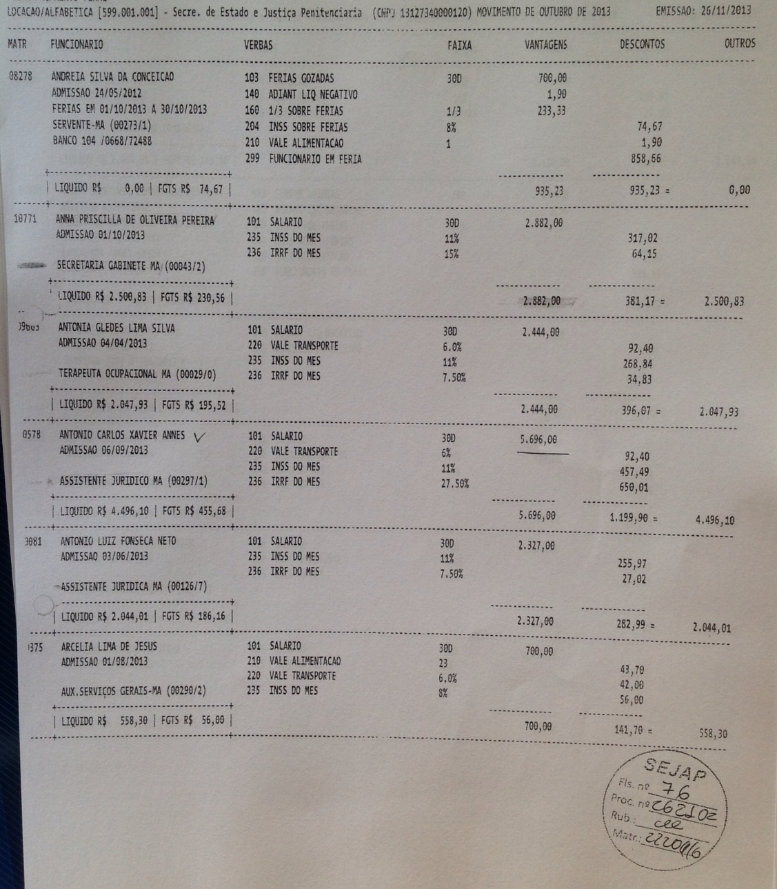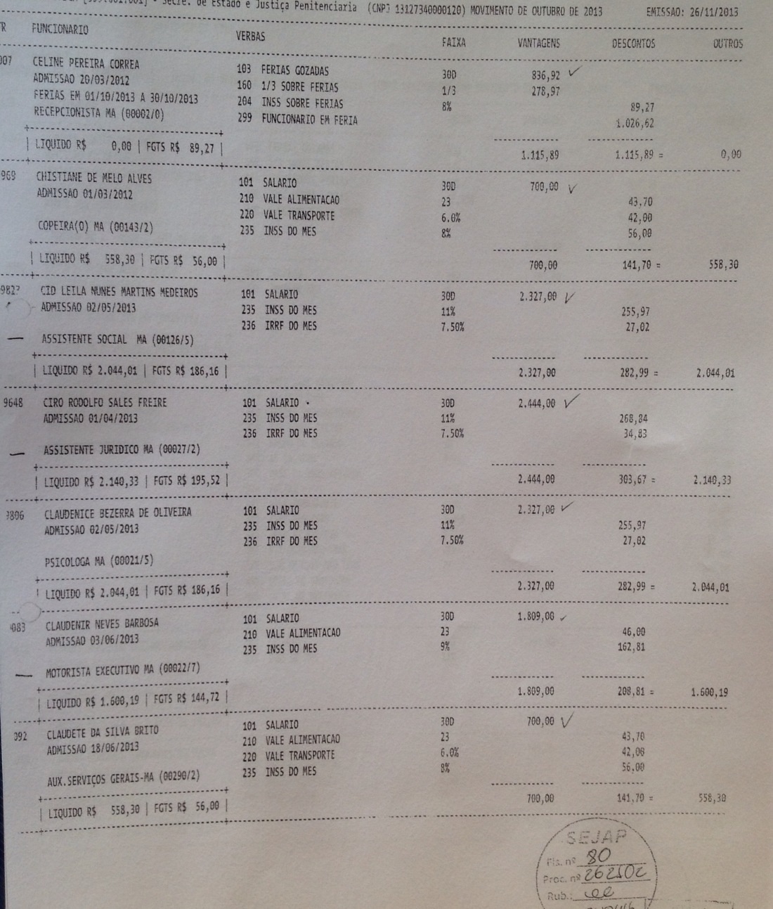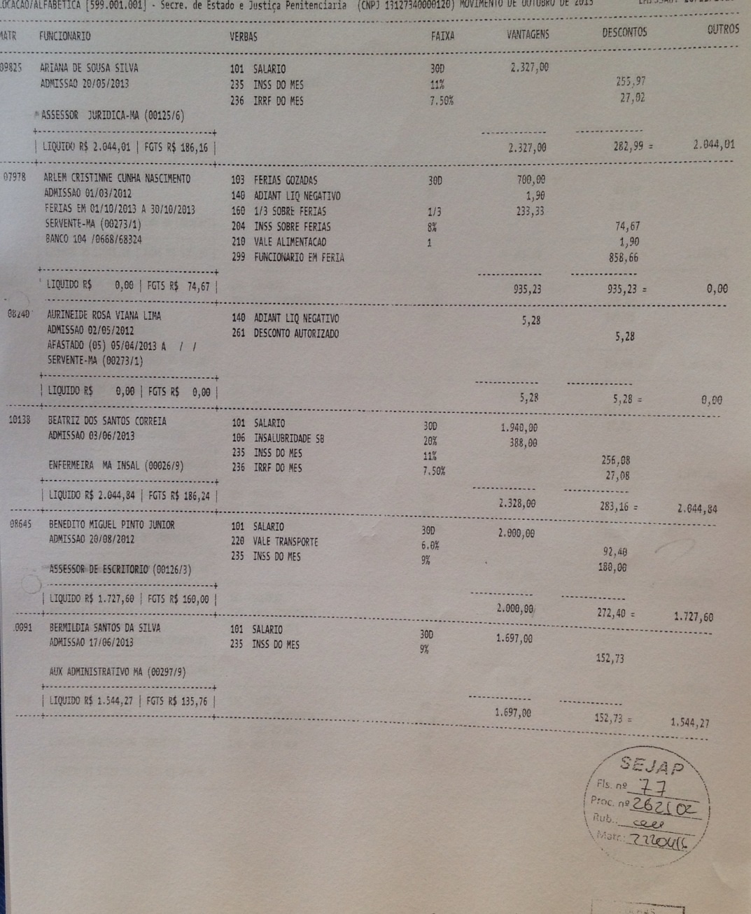 Abaixo a relação de parte dos funcionários da empresa de Eric Marinho que recebem através do contrato da secretaria SEJAP: