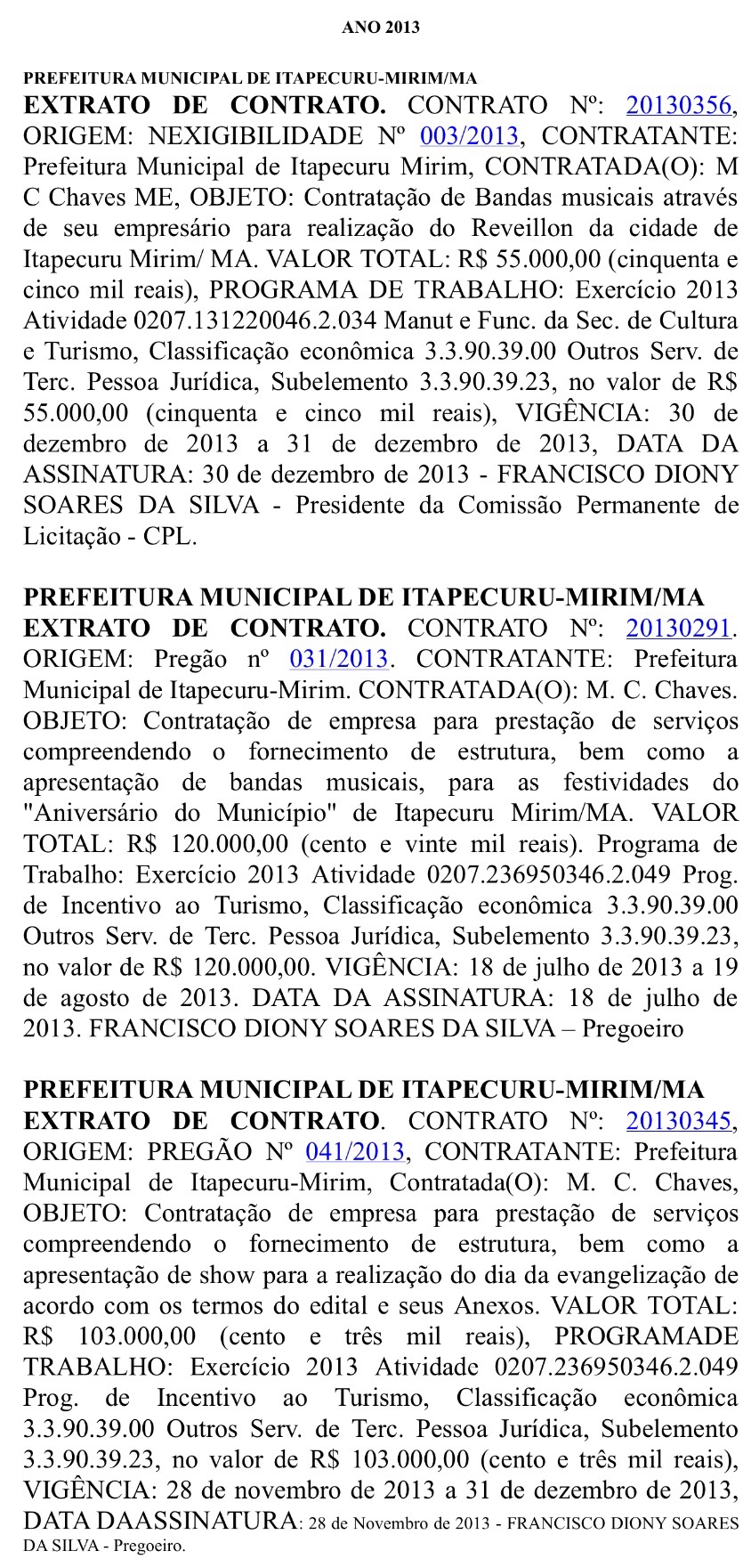 EXTRATO DE CONTRATO. CONTRATO Nº: 20130166. ORIGEM: Pregão nº 009/2013-AS. CONTRATANTE: Fundo Municipal de Saúde. CONTRATADA (O): T.T.O. Borges-ME. OBJETO: Contratação de Empresa para realizar exames laboratoriais junto a Secretaria Municipal de Saúde de Itapecuru-Mirim/MA. VALOR TO TAL: R$ 691.740,63 (seiscentos e noventa e um mil, setecentos e quarenta reais e sessenta e três centavos). PROGRAMA DE TRABALHO: Exercício 2013 Atividade 0210.103010172.2.067 Manutenção do Bloco de Media e Alta Comp.Ambul e Hospitalar, Classificação econômica 3.3.90.39.00 Outros Serv. de Terc. Pessoa Jurídica, Subelemento 3.3.90.39.05, no valor de R$ 691.740,63. VIGÊNCIA: 01 de abril de 2013 a 31 de dezembro de 2013. DATA DA ASSINATURA: 01 de abril de 2013. MAGNO ROGÉRIO AMORIM – Prefeito.
