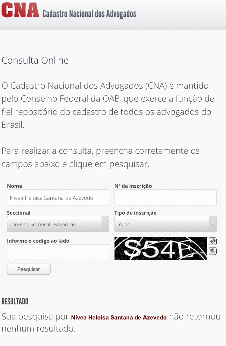Nívea Santana foi ungida ao cargo de Chefe da Assessoria Jurídica por indicação do sorgo, mas não possui inscrição na Ordem dos Advogados do Brasil (OAB), conforme mostra (veja abaixo) a pesquisa no Cadastro Nacional dos Advogados.