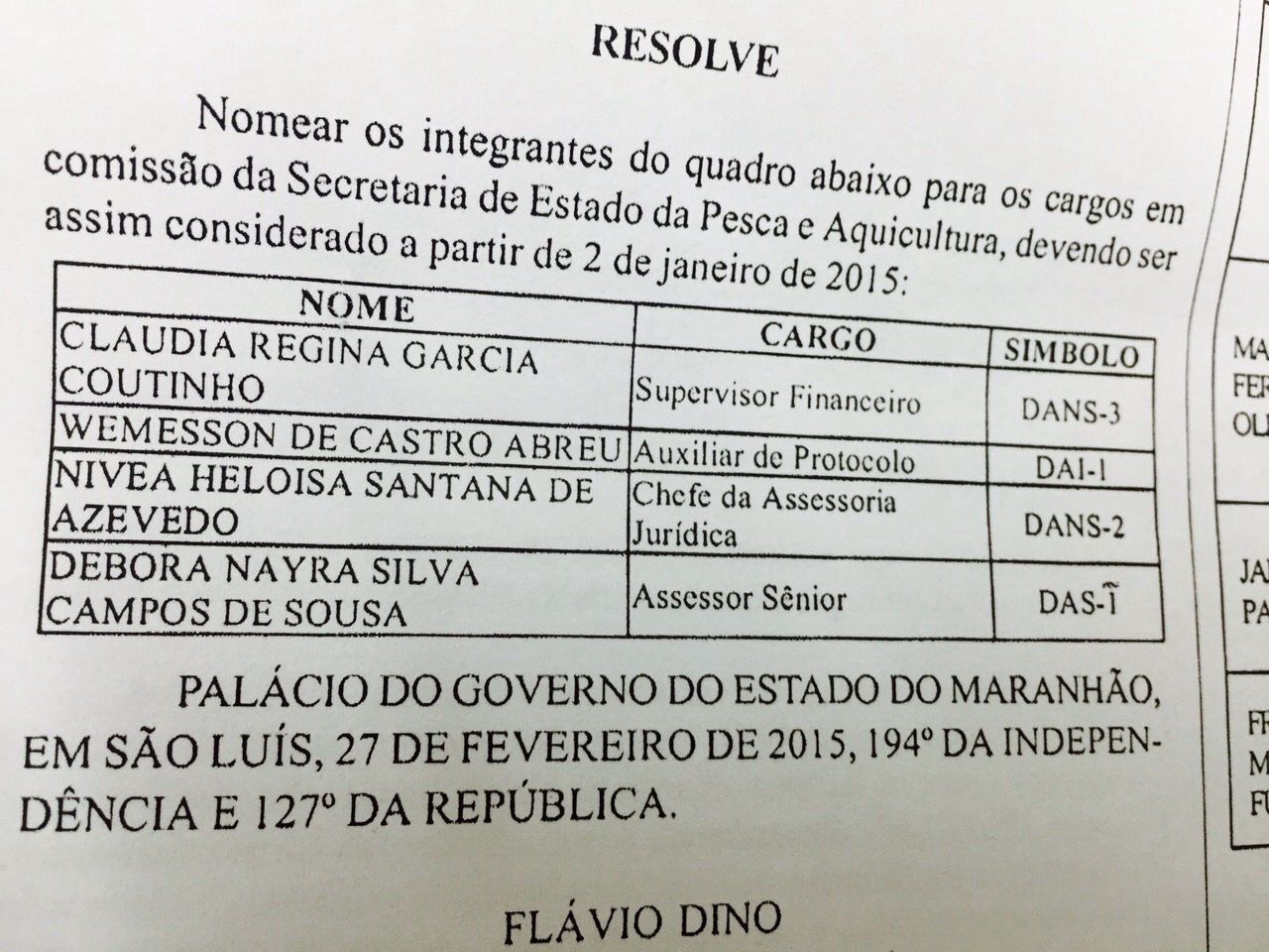 A irregularidade na nomeação obriga o governador Flávio Dino, que foi induzido ao erro pelo secretário de Pesca, a exonerar embasado na portaria baixada pelo secretário chefe da Casa Civil, Marcelo Tavares, que determina nomeações jurídicas no governo para causídicos que possuem a OAB.
