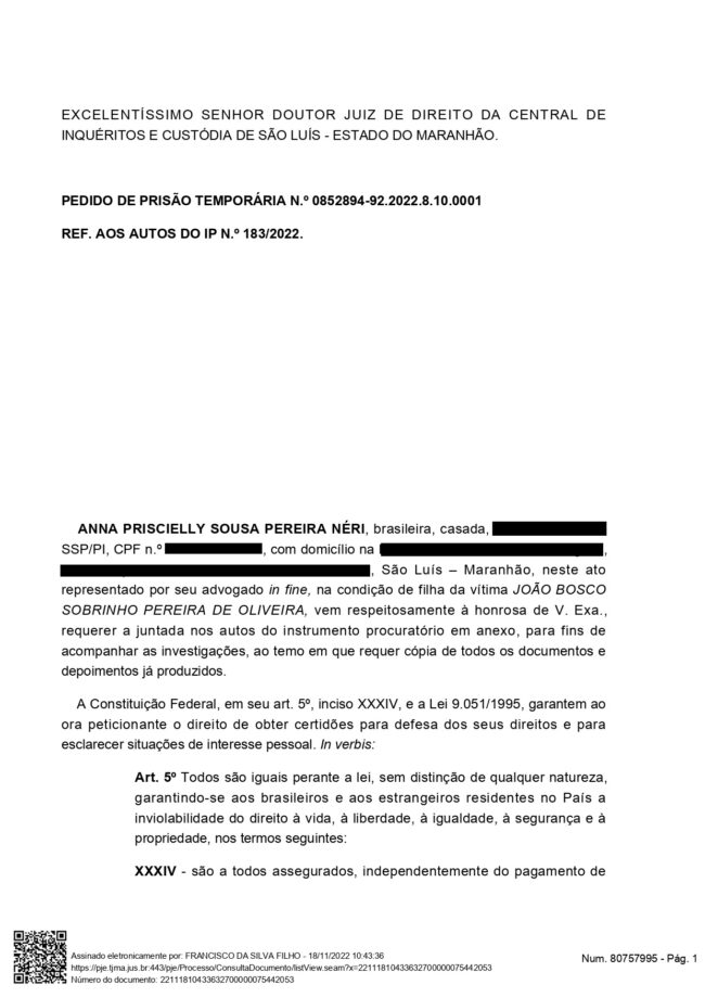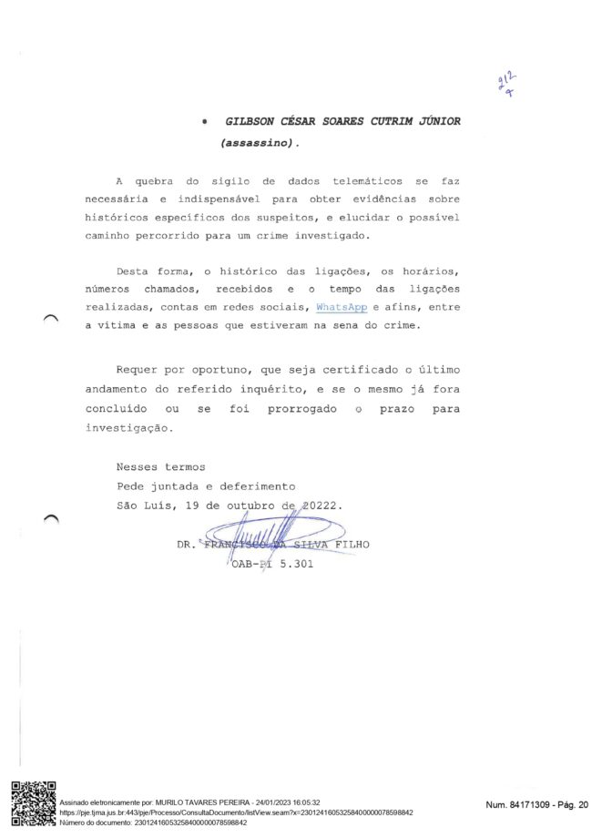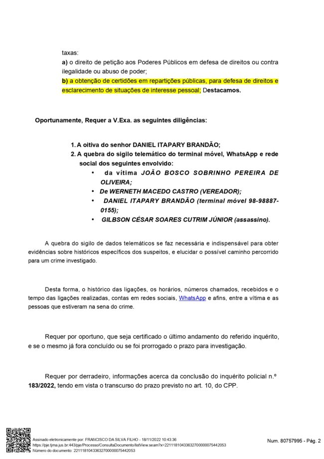 “A quebra de sigilo de dados telemáticos se faz necessária e indispensável para obter evidências sobre históricos específicos dos suspeitos, e elucidar o possível caminho percorrido para um crime investigado. Desta forma, o histórico das ligações, os horários, números chamados, recebidos e o tempo das ligações realizadas, contas em redes sociais, whatsapp e afins, entre a vítima e as pessoas que estiveram na cena do crime,” diz trecho do documento.