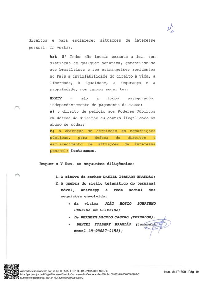 Citado três vezes em depoimentos prestados à polícia no âmbito do inquérito que investiga a morte do empresário João Bosco Sobrinho Pereira Oliveira, executado no dia 19 de agosto de 2022 por Gilbson César Soares Cutrim Júnior, o advogado Daniel Itapary Brandão, sobrinho do governador Carlos Brandão (PSB), teve pedido de quebra do seu sigilo telemático após suspeita de ligação com o crime.