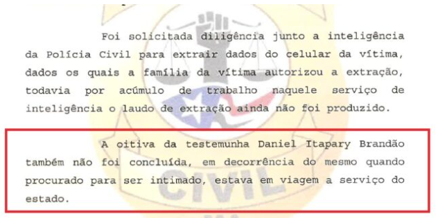 Anna Priscielly ainda requereu que Daniel Brandão prestasse depoimento, mas isso não ocorreu, alegou que estava em viagem a serviço do Estado.