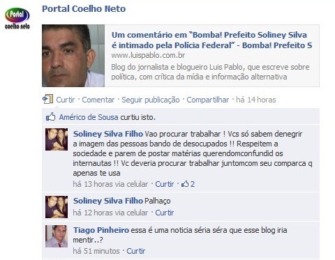 Irritado por o Portal Coelho Neto ter replicado na rede social a notícia de que o pai teria sido intimado na última quinta-feira (13) pela Polícia Federal, Soliney Filho partiu para as agressões verbais. Ele é provável candidato à deputado estadual em 2014.