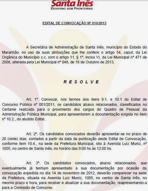 Depois de muita briga e até o MP intervir, a prefeitura de Santa Inês publicou o Edital número 010/2013 em que convoca candidatos classificados no Concurso Público 001/2011, realizado para provimento do quadro de pessoal na área da Educação. Os candidatos convocados deverão se apresentar no prazo de 20 dias, munidos de documentação para investidura nos cargos.
