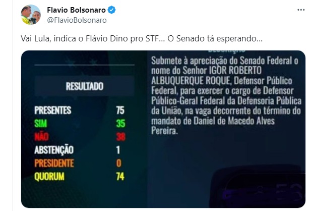 Em tom de provocação, o senador Flávio Bolsonaro (PL), publicou nas redes sociais uma foto do resultado da votação que rejeitou o nome de Igor Roque para a Defensoria Pública da União