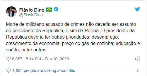 Para o governador, o assunto deveria ser tratado pela polícia e não por Bolsonaro. “Morte de miliciano acusado de crimes não deveria ser assunto do presidente da República, e sim da Polícia. O presidente da República deveria ter outras prioridades: desemprego; crescimento da economia; preço do gás de cozinha; educação e saúde, entre outros.”