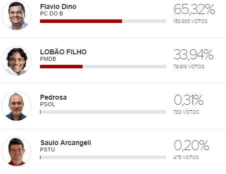 Flávio Dino tem 65,32%; Edinho Lobão 33,94%; confira em tempo real 05/10/2014 | PÁGINA PRINCIPAL, Notícias Navegação de Post Roberto Rocha é o primeiro na lista dos senadoresOs 10 candidatos mais votados para deputado federal