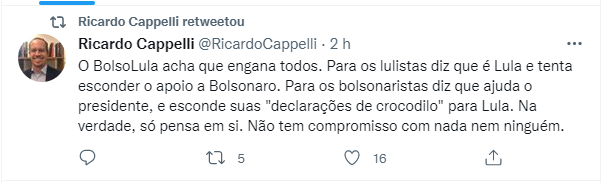 O auxiliar de Brandão escreveu: “O BolsoLula acha que engana todos. Para os lulistas diz que é Lula e tenta esconder o apoio a Bolsonaro. Para os bolsonaristas diz que ajuda o presidente, e esconde suas “declarações de crocodilo” para Lula. Na verdade, só pensa em si. Não tem compromisso com nada nem ninguém”.