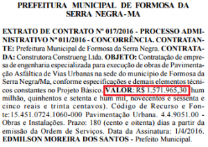 A empresa que levou a melhor foi a Construtora Construeng, que deve realizar a obra no prazo de 180 dias, ou seja, o serviço deve ficar pronto até o dia 1° de outubro, véspera do pleito. Confira o extrato do contrato, publicado no Diário Oficial do Maranhão: