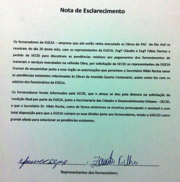 Um grupo de fornecedores que trabalham na obra do IV Centenário encaminharam nota ao Blog do Neto Ferreira afirmando o interesse do secretário Hildo Rocha. Segundo eles, Hildo se mostrou preocupado que fosse efetuado o pagamento para os empresários o mais rápido possível.