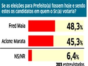 De acordo com os números, Fred Maia (PMDB) tem 48,3%, em segundo lugar, aparece Acione Lisboa da Silva, a Acione Marata (PCdoB) com 45,3%, na estimulada.