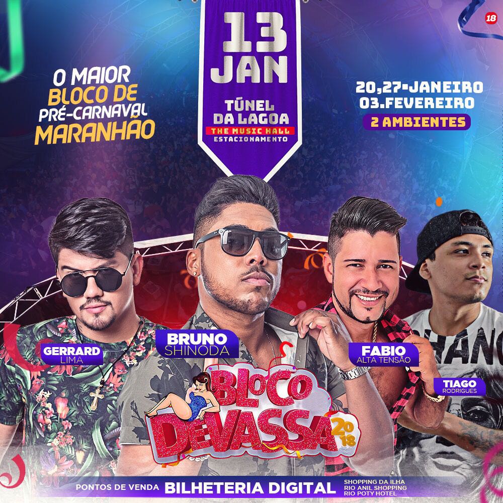 Para animar a galera, o bloco vai apresentar os cantores Gerrad Lima , Bruno Shinoda, Fábio Alta Tensão e Tiago Rodrigues. Ingressos antecipados na Bilheteria Digital.