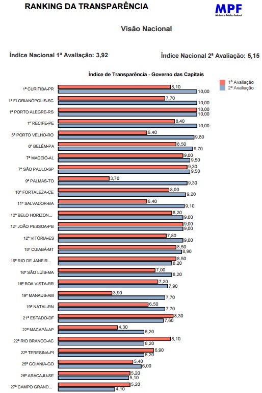 O relatório divulgado nesta quarta-feira (08) pelo Ministério Público Federal – feito pelo projeto Ranking Nacional da Transparência, patrocinado pela Câmara de Combate à Corrupção do MPF – coloca São Luís na 16ª colocação entre as capitais brasileiras. A cidade é administrada por Edivaldo Holanda Júnior (PDT).