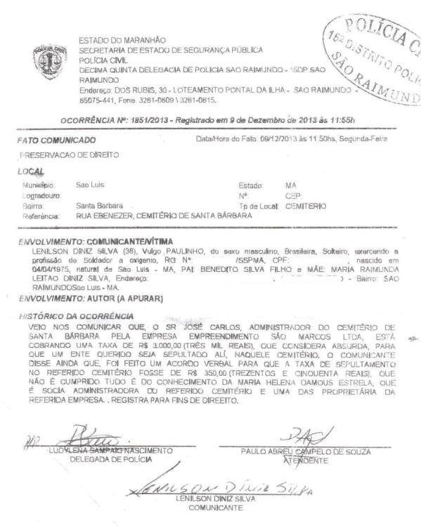 A cobrança irregular foi denunciada à polícia pelo soldador Lenilson Diniz Silva, através de um Boletim de Ocorrência registrado, no dia 09 de dezembro de 2013, na Delegacia do São Raimundo.
