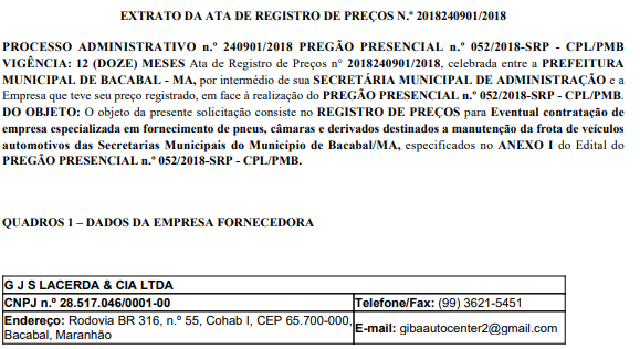 O valor do contrato foi estimado em R$ 171.105,00 mil, sendo que a Giba Pneus e Serviços, localizada em Bacabal e de propriedade de Leonardo Sousa Lacerda e Gilberto Júnior Sousa Lacerda, vai faturar R$ 169.357,00 mil.