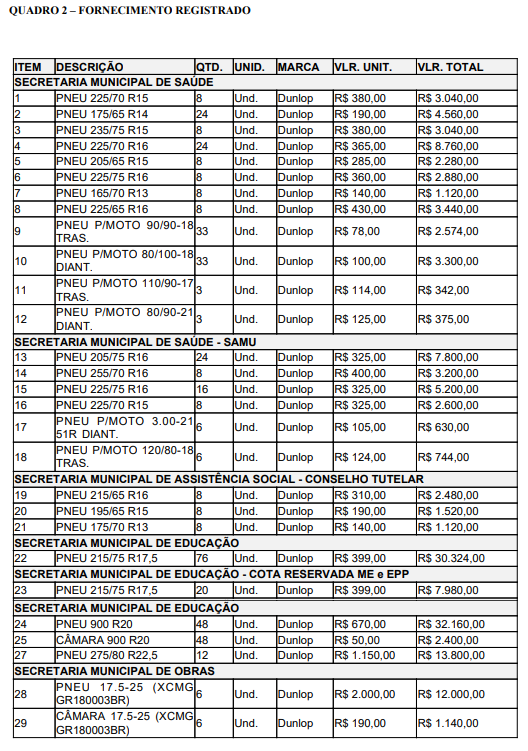 Para fornecer os produtos, foram contratadas duas empresas, a G.J.S. Lacerda&CIA Ltda, que tem como nome fantasia Giba Pneus e Serviços, e a El Elyon Pneus Eireli.