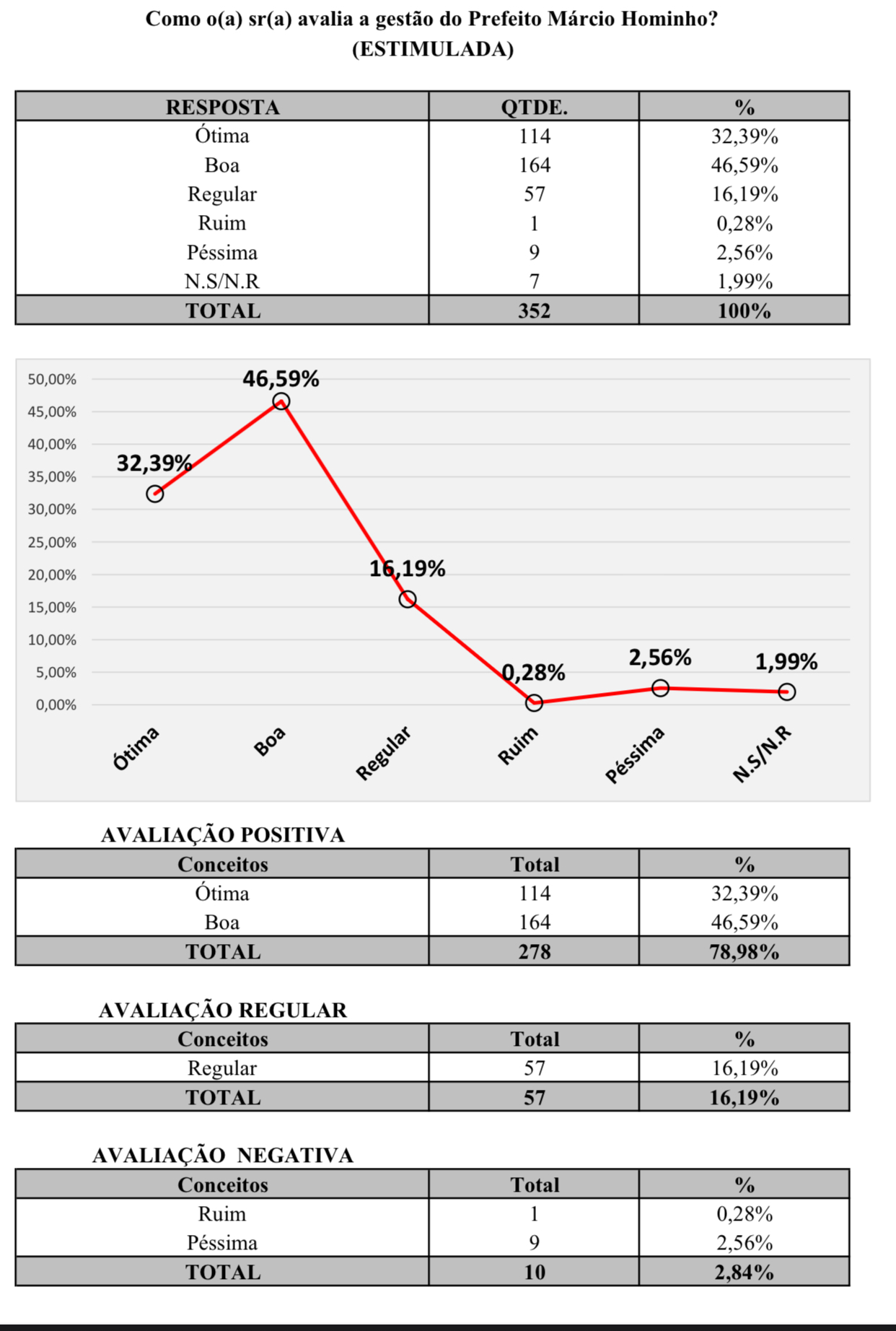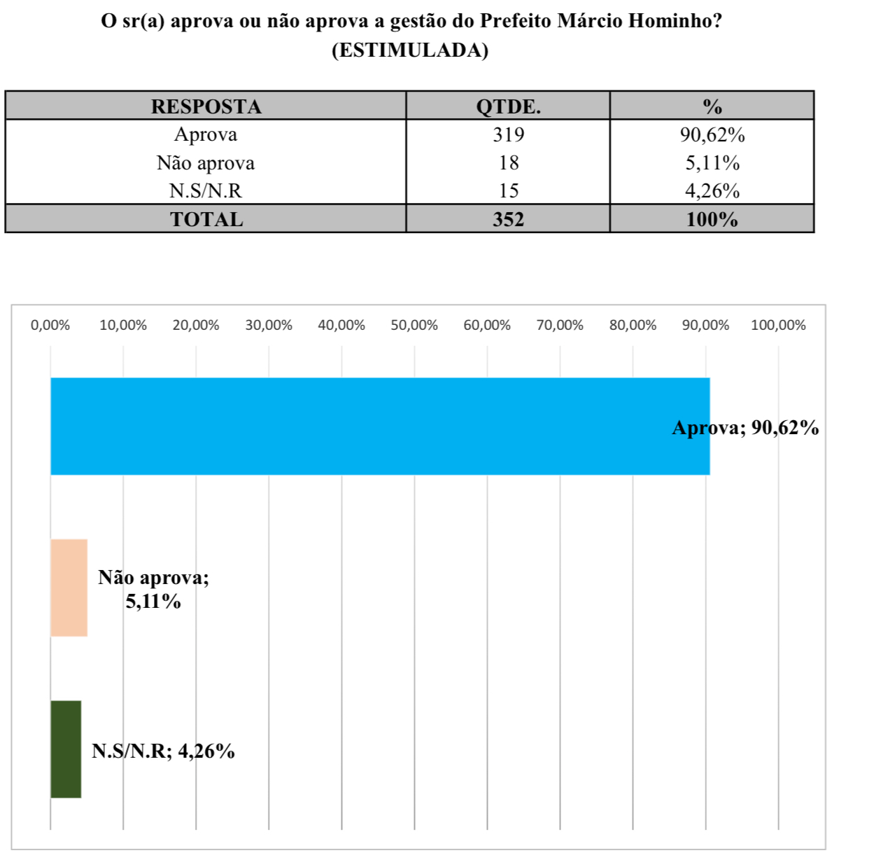 Segundo os números, a administração de Márcio Hominho somou 90,62% de aprovação e apenas 5,11% da população desaprova a gestão municipal. Não sabe ou não respondeu pontuou 4,26%.
