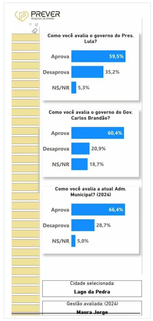 A mesma consulta aponta, ainda. que Brandão tem 60,4% de aprovação em Lago da Pedra.”
