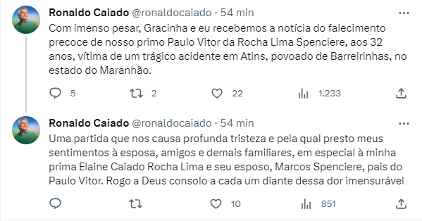 Em nota divulgada nas redes sociais, o governador de Goiás, Ronaldo Caiado, lamentou a morte do seu primo Paulo Vitor Spenciere em acidente de quadriciclo em Atins, ocorrido na noite de terça-feira (8).