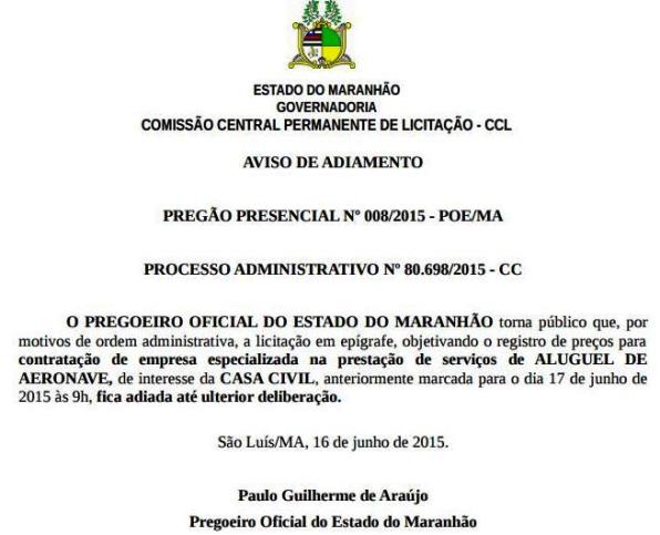 No documento de suspensão da licitação, o pregoeiro Paulo Guilherme não detalha o motivo que levou o estado a recuar da contratação, um dia antes de celebrar o pregão presencial.