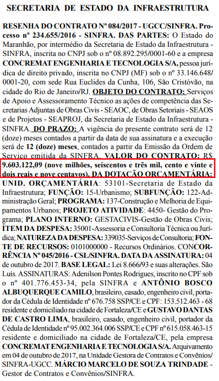 O Governo do Maranhão, por meio da Secretaria de Infraestrutura (Sinfra) firmou um contrato milionário com a empresa Concremat Engenharia e Tecnologia, que fica localizada no Rio de Janeiro (RJ).
