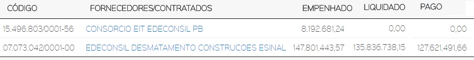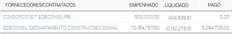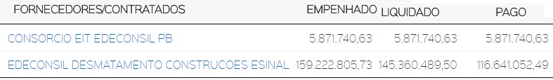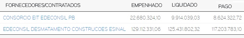 Em 2015, governo repassou para Edeconsil Desmatamento R$ 127.621.491,66; 2016 R$ 8.624.322,72 para Consorcio Edeconsil e R$ 117.203.783,10 para Edeconsil Desmatamento; 2017 o consórcio recebeu R$ 5.871.740,63 e mais R$ 116.641.052,60 foi repassado para construtora de Fernandão.