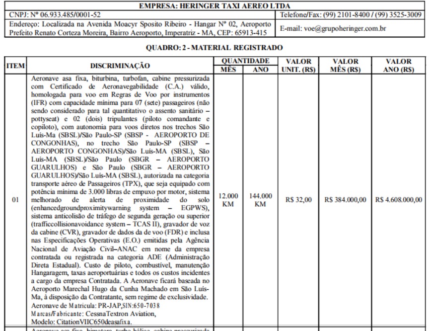 A locação do transporte aéreo, de modelo Citation VIIC 650, irá custar aos cofres públicos cerca de R$ 4.608.000,00 milhões.