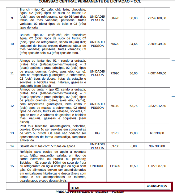 É muito triste da ate vontade de chorar,olhar uma farra dessa com o dinheiro público. Enquanto o governo gasta quase 50 milhões com um buffet a população passa por muitas dificuldades na segurança,educação e na saúde principalmente. Isso é uma coisa q dói na alma e o que doi mais ainda é saber que as autoridades competentes olham e não fazem nada simplesmente tão fazendo vista grossa e detalhe essa é apenas uma licitação só imagina as demais,gosto de muita coisa que Flávio Dino fez e no meu ponto de vista ele foi um bom governador mais infelizmente tem coisas que agente olha que nos deixa muito revoltado triste angustiado.