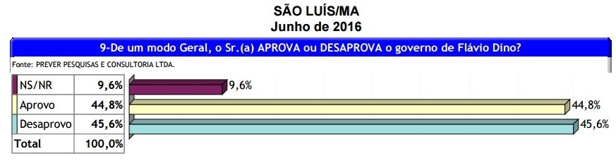 O levantamento apontou que 45,6% do eleitorado desaprova o atual governo e 44,8% aprova, ou seja, a maioria reprova a administração de Dino. 9,6% não souberam ou não quiseram responder.