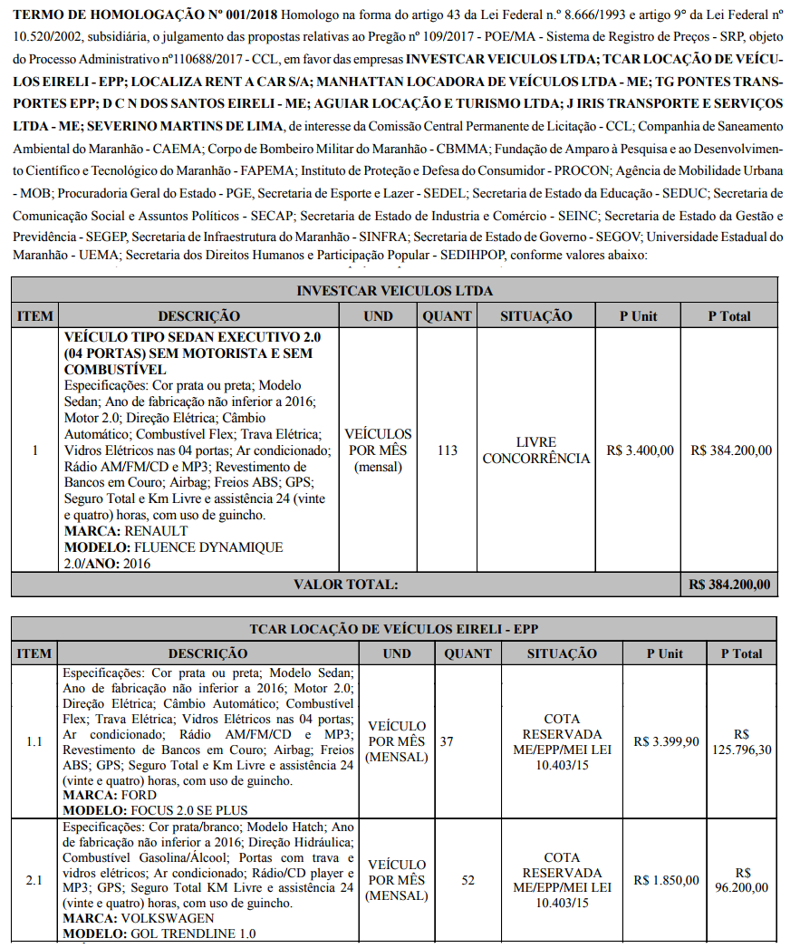 De acordo com o Termo de Homologação publicado no Diário Oficial, diversas Secretarias e órgãos estaduais serão beneficiados com as locações dos veículos.