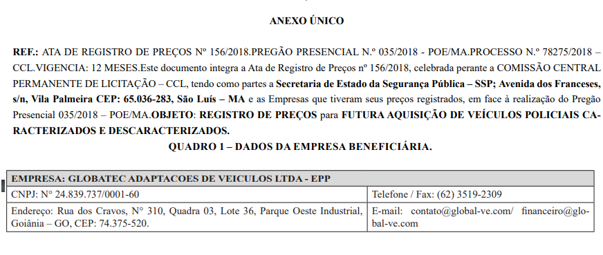 Conforme foi publicado no Diário Oficial, o contrato milionário foi firmado com a empresa Globatec Adaptações de Veículos Ltda, localizada em Goiânia (GO).